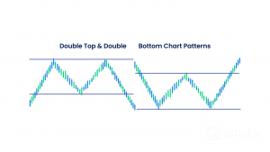 The double bottom double top chart pattern indicates trend reversals. They consist of either two high prices (double top) or two low prices (double bottom) of the currency pair. It is unlikely for a currency pair to move beyond the high price point and below the low price point after it does so twice on different occasions.