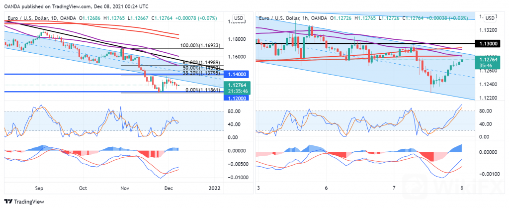 Or, we could see a breakaway attempt in the other direction. The first hurdle here is 1.13. A move above here takes us above the descending channel on the one-hour chart, and the 55/89 and 200/233-hour SMA bands.
