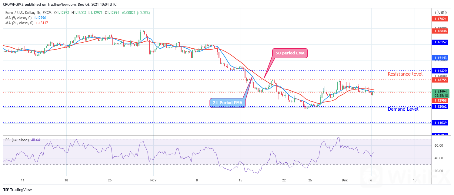 The EURUSD price is currently trading below the 9 periods EMA and 21 periods EMA in which the former is making attempt to cross the later upside. The relative strength index period 14 is at 40 levels and the signal lines pointing down to indicate a sell signal. EURUSD price may retest the previous low of $1.1206 support level, breaking it down may reduce the price to $1.1206 and $1.1103. Should the level of $1.1295 holds, the price may reverse and face resistance level of $1.1375 and $1.1432.