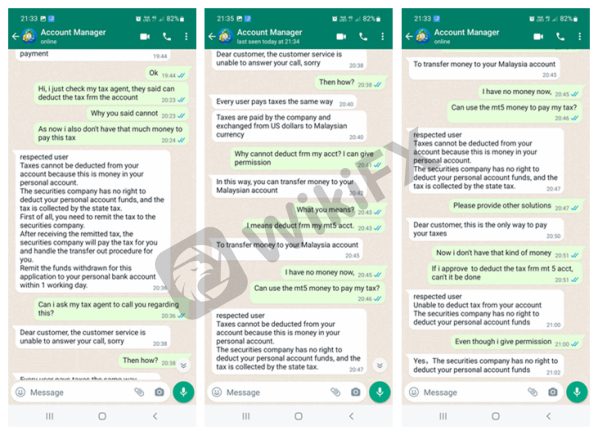 He can't withdraw because he didnt have that much money to pay the tax. After many times of communication, biggloballtd always insisted that the only way for him to withdraw was to pay the tax first, and the tax could not be directly deducted from his account. And he was suggested to borrow money from his surroundings to finish the taxes problem. And at that time, he knew he was scammed.