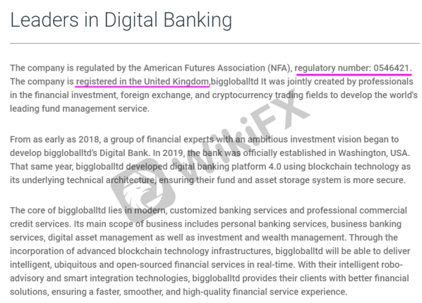 As you can see, biggloballtd claims that it is regulated by the American Futures Association (NFA) under regulatory number 0546421 and is registered in the United Kingdom.