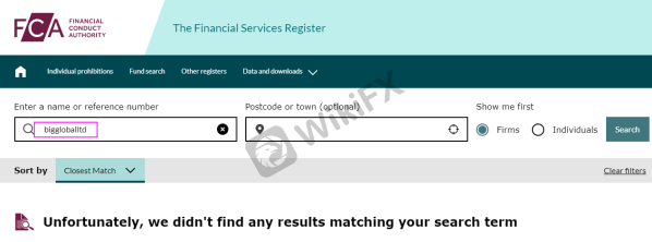 Searching with biggloballtd on the FCA Registry, we We also found no license matching results. That is to say – the firm is an unlicensed broker who runs without any licenses.
