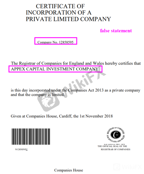 Appex Capital claims it is a Private Limited Company registered with the Companies House of United Kingdom (CH) under company number 12858595.
