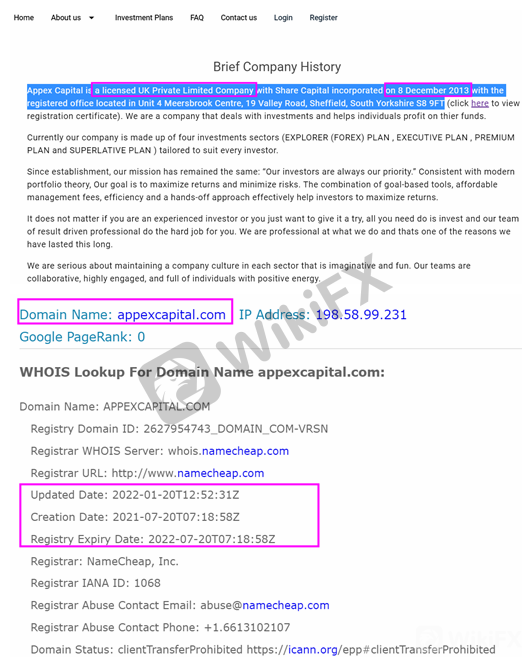 In the “About US”, Appex Capital insists that it is a licensed UK Private Limited Company with Share Capital incorporated on 8 December 2013. But the domain check result shows it was newly established on 20 July 2021. This is a red flag here.