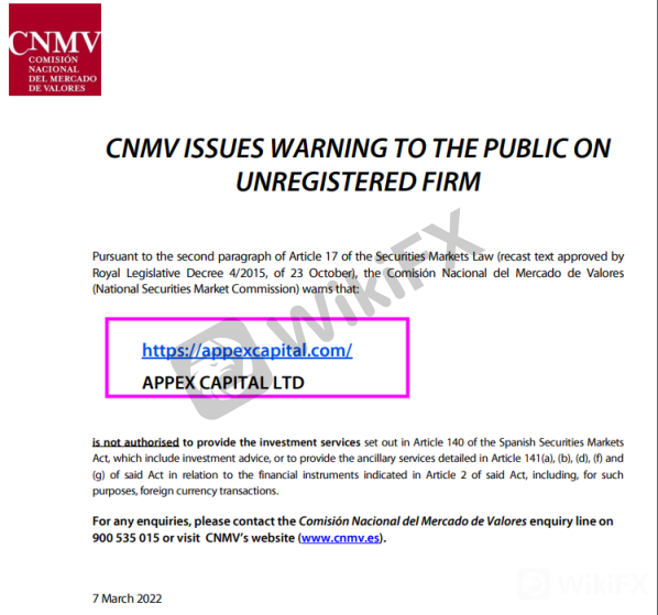 What's more, On 7 March 2022, the Spanish financial authority CNMV issued a warning that Appex Capital has not been authorized to carry out investment services and activities. That is to say, Appex Capital is an unregulated forex broker. If clients invest their funds in the firm, they are unlikely to get their money back if things go wrong.
