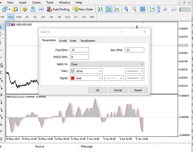The first is the fast 13 period EMAand then the slow 21 period EMA. The MACD line (shown as the grey histogram) is automatically plotted. It can be calculated by subtracting the slow EMA from the fast EMA. The third MA – 8 period SMA (simple moving average) is plotted across the grey histogram. It is shown by the red dotted line and is usually called the signal line. The basis of the combination is to give a buy and sell signal on any instrument it is plotted and on any time frame. The MACD automatically adjusts to a new time frame. The settings on the MT4 can be changed. The default setting on MT4 is 12,26,9.