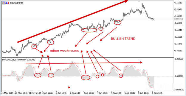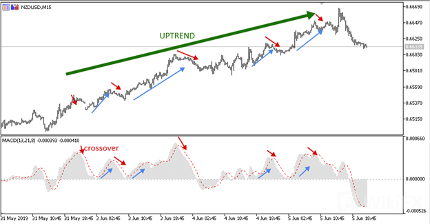 This is one of the most popular ways of MACD application. In an uptrend (when the signal line and MACD are above the zero line), if the signal line crosses below the MACD histogram, it means the prevailing trend will be weak. However, after the weakness, the signal line crosses above the MACD, it indicates a bullish trend continuation. In a downtrend (when the MACD and the signal line are below the zero line), if the signal line crosses the MACD upwards, it indicates bearish trend weakness. If after the weakness, the signal line crosses the MACD downwards, it indicates bearish trend continuation.