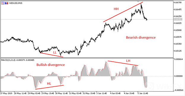 A bearish divergence forms a higher high on the price and a lower high on the MACD. Bearish divergence gives a sell signal. A bullish divergence occurs when the price makes a lower low while the MACD makes a higher low. This indicates a buy signal.