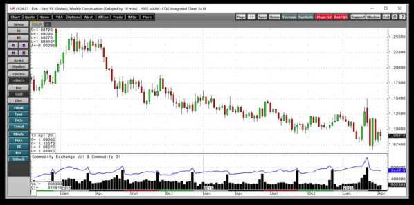 The weekly chart of the dollar versus the euro futures contract displays the price action in the currency pair since late 2017. The bar chart on the bottom reflects the weekly volume, which is the total number of transactions. The line above volume is the open interest or the total number of long and short positions.