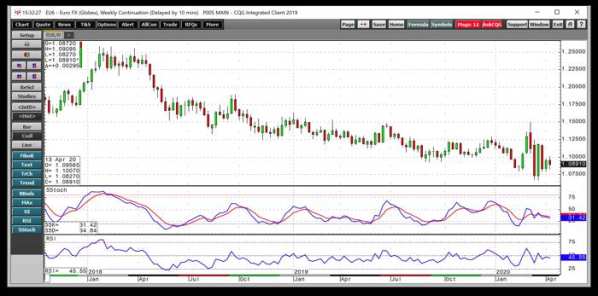 Beneath the weekly price chart, the slow stochastic is an oscillator that aims to quantify the momentum of a price rise or decline. Stochastics work by comparing closing prices with price ranges over time. The theory behind this technical tool is that prices tend to close near the highs in rising markets and near the lows in falling markets.