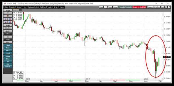 The chart of the currency relationship between theUS and Australian dollar shows that the price broke down below technical support and experienced a spike to the downside. The price movement turned out to be a “blow-off” low on the downside that reversed after reaching a significantly lower price.