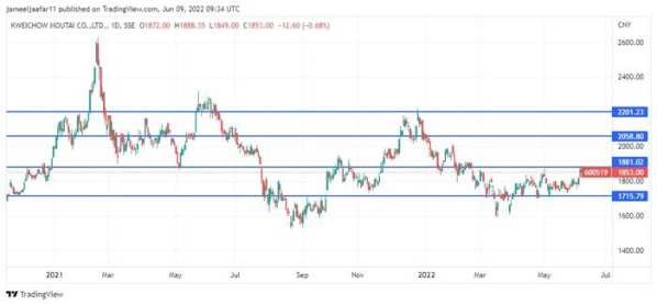 Currently priced at ¥1,853 ($227), the Kweichow Moutai stock is trading in the lower-middle part of its 52-week range, between a support level of ¥1,715 and a three resistance levels; a low one at ¥1,881, another at ¥2,058 and a higher resistance mark near ¥2,200.