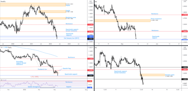 Of technical relevance on the daily chart is the bearish flag pattern, made up between $1.0471 and $1.0593. Thursday‘s down move welcomed a breakout of the noted pattern, which led the currency pair to daily Quasimodo support (see above), a base closely shadowed by a 1.272% Fibonacci projection at $1.0305. Interestingly, pattern traders have likely pencilled in the bearish flag’s profit objective within striking distance of parity ($1.0000).
