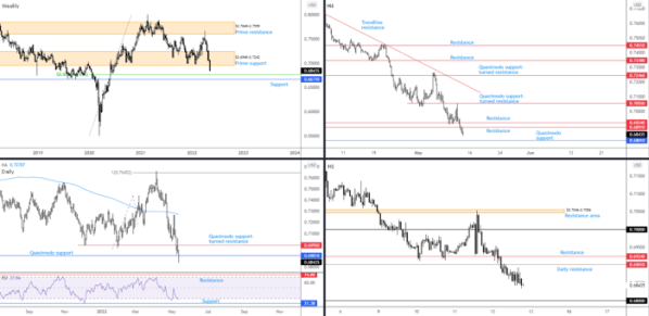In a market demonstrating a downside bias, with price action also trading south of its 200-day simple moving average at $0.7271, daily flow engulfed Quasimodo support at $0.6901 on Thursday and potentially set the technical stage for an approach towards daily support at $0.6678 (plotted nearby weekly support mentioned above at $0.6673).
