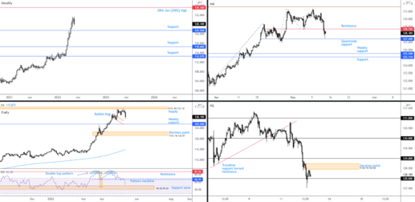 For now, chart studies indicate a short-term bearish vibe. Should the H1 decision point at ¥128.74-128.44 hold, theres little in the way of a drop towards ¥127.