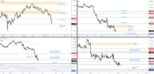 Meanwhile on the daily timeframe, scope for further bearish activity is visible until support coming in from $1.2018, following the retest of Quasimodo support-turned resistance at $1.2334. For those who follow our analysis on a regular basis you may also recall that continued downside followed the formation of a daily bearish flag pattern formed in early May, made up between $1.2411 and $1.2614 (the profit objective can be plotted as far south as $1.18).