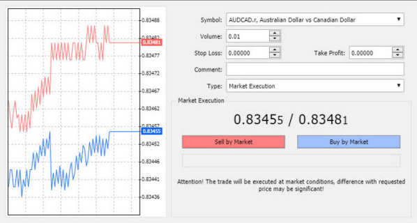 Additionally, you can have a 1-click trading box in the upper left side that allows you to instantly place a trade. You can place your trade using market execution or pending order. You also can determine the volume of your trade. Below is the bid-offer spread. As a market taker, you buy on the offer (the blue) and sell on the bid (the red).