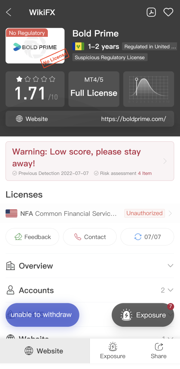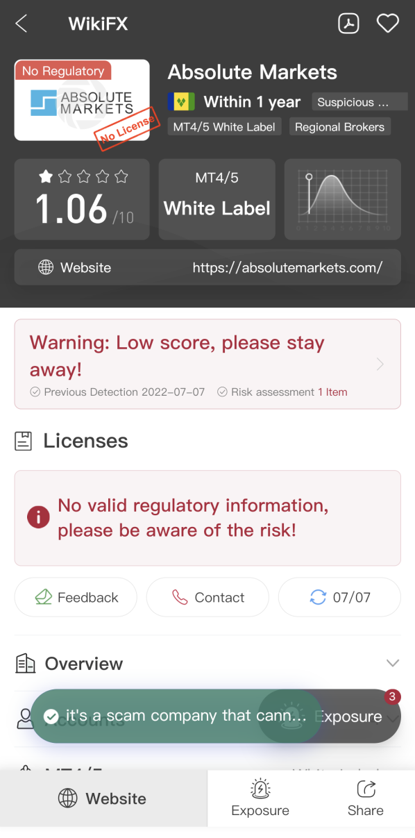 Also, due to the fact that both Absolute Markets and Bold Prime have achieved low WikiFX scores as they do not hold any valid licenses and regulatory statuses, alongside several Exposure cases.