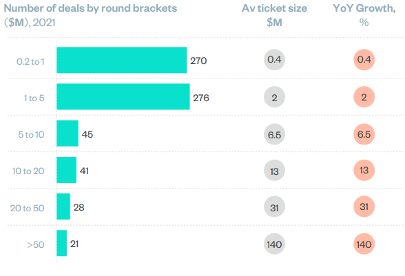 •   Over 600 deals in this bracket compared to less than 150 in higher brackets 1-5million round experienced the fastest growth compared to all brackets (142%)1.